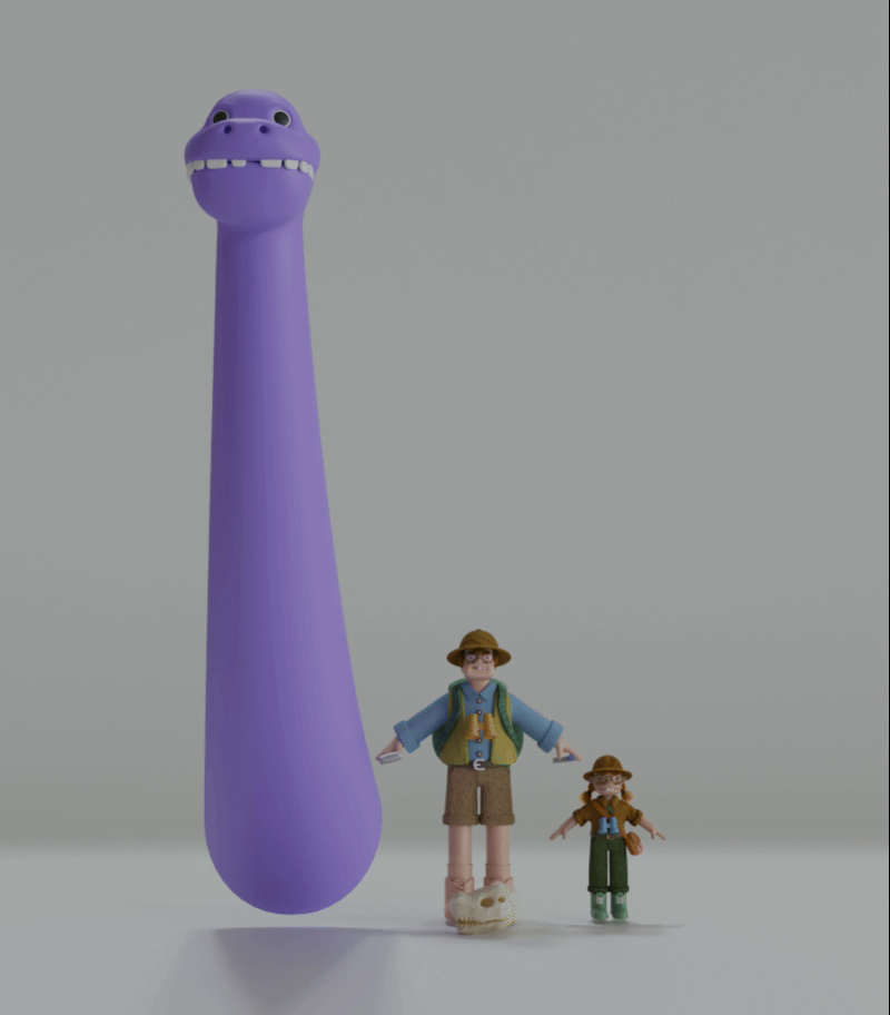 “Discovery” is a small 8-second animation I made for this exhibition. It’s about a father and daughter who are obsessed with dinosaurs in the deepest jungle. I wanted to create something heartfelt, fun, and a bit charming. It’s also a kind of love letter to American cinema—the first movie I ever saw in a theater was Jurassic Park, and I was obsessed with dinosaurs for a while after that. I started wondering: what if dinosaurs could see people digging up their bones? That idea became the starting point for this piece.